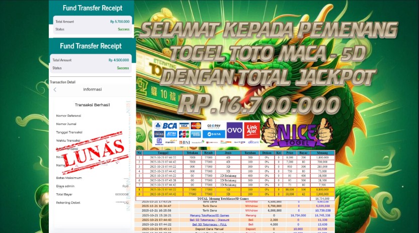 Selamat kepada User id : WRYDHA** Telah berhasil mendapatkan kemenangan besar pada permainan JACKPOT TOGEL TOTOMACAU 5D Dengan kemenangan Sebesar Rp.16.700.000,- Setelah mengisi formulir withdraw dengan kurung waktu hanya 5 – 10 menit pihak NICETOGEL sudah melakukan transfer kepada pemilik Userid dan dana sudah dapat di cairkan oleh pemenang. Bukti pembayaran yang kami berikan merupakan bukti pembayaran yang SAH / VALID yang langung di dapatkan melaui tanda transfer transaksi dari Bank yang di tuju.