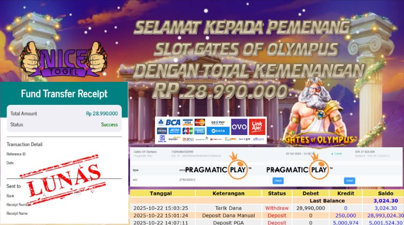 Selamat kepada User id : ANDIN7**** Telah berhasil mendapatkan kemenangan besar pada permainan JACKPOT SLOT GATES OF OLYMPUS Dengan kemenangan Sebesar Rp.28.990.000,- Setelah mengisi formulir withdraw dengan kurung waktu hanya 5 – 10 menit pihak NICETOGEL sudah melakukan transfer kepada pemilik Userid dan dana sudah dapat di cairkan oleh pemenang. Bukti pembayaran yang kami berikan merupakan bukti pembayaran yang SAH / VALID yang langung di dapatkan melaui tanda transfer transaksi dari Bank yang di tuju.