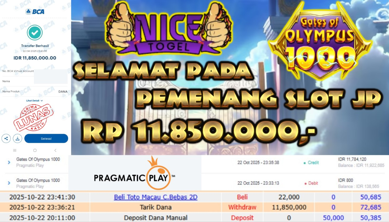 Selamat kepada User id : canono**** Telah berhasil mendapatkan kemenangan besar pada permainan JACKPOT SLOT GATES OF OLYMPUS 1000 Dengan kemenangan Sebesar Rp.22.060.000,- Setelah mengisi formulir withdraw dengan kurung waktu hanya 5 – 10 menit pihak NICETOGEL sudah melakukan transfer kepada pemilik Userid dan dana sudah dapat di cairkan oleh pemenang. Bukti pembayaran yang kami berikan merupakan bukti pembayaran yang SAH / VALID yang langung di dapatkan melaui tanda transfer transaksi dari Bank yang di tuju.