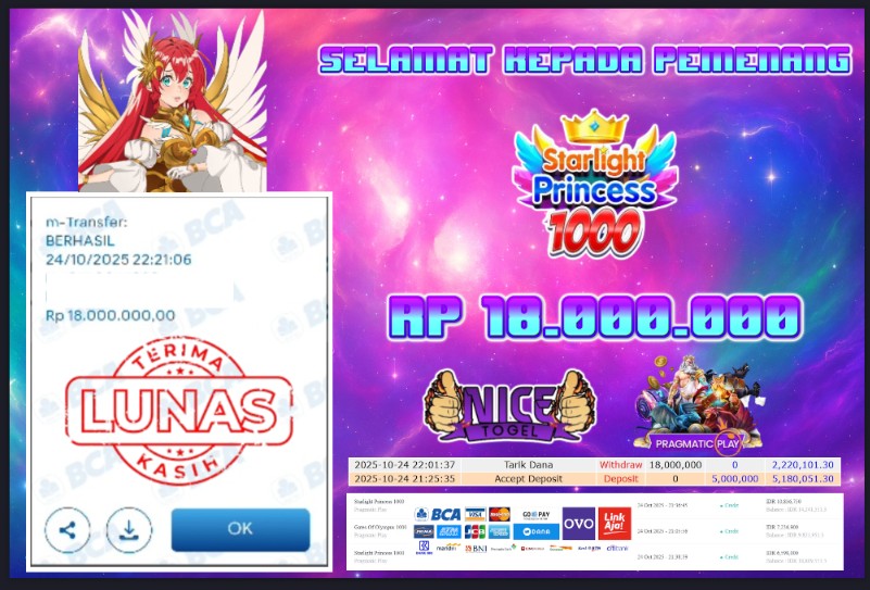 Selamat kepada User id : ELNI** Telah berhasil mendapatkan kemenangan besar pada permainan JACKPOT SLOT STARLIGHT PRINCESS 1000 Dengan kemenangan Sebesar Rp.18.000.000,- Setelah mengisi formulir withdraw dengan kurung waktu hanya 5 – 10 menit pihak NICETOGEL sudah melakukan transfer kepada pemilik Userid dan dana sudah dapat di cairkan oleh pemenang. Bukti pembayaran yang kami berikan merupakan bukti pembayaran yang SAH / VALID yang langung di dapatkan melaui tanda transfer transaksi dari Bank yang di tuju.