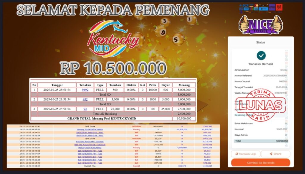 Selamat kepada User id : NAY11** Telah berhasil mendapatkan kemenangan besar pada permainan JACKPOT TOGEL KENTUCKY LOTTERY Dengan kemenangan Sebesar Rp.10.500.000,- Setelah mengisi formulir withdraw dengan kurung waktu hanya 5 – 10 menit pihak NICETOGEL sudah melakukan transfer kepada pemilik Userid dan dana sudah dapat di cairkan oleh pemenang. Bukti pembayaran yang kami berikan merupakan bukti pembayaran yang SAH / VALID yang langung di dapatkan melaui tanda transfer transaksi dari Bank yang di tuju.