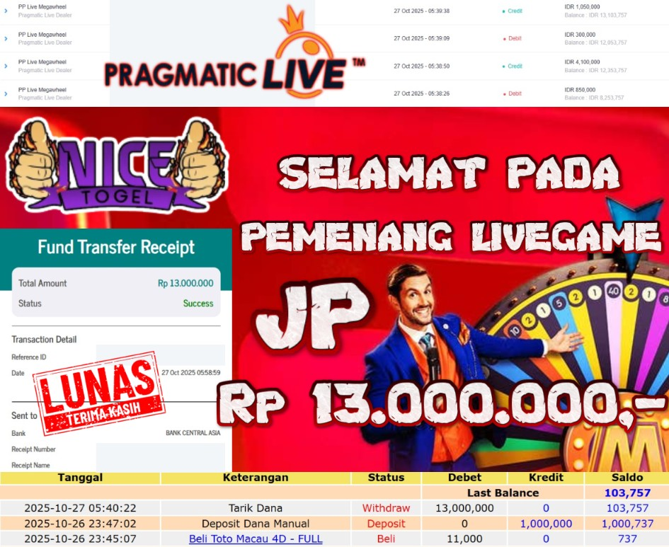 Selamat kepada User id : RISAU**** Telah berhasil mendapatkan kemenangan besar pada permainan JACKPOT LIVE MEGAWHEEL Dengan kemenangan Sebesar Rp.13.000.000,- Setelah mengisi formulir withdraw dengan kurung waktu hanya 5 – 10 menit pihak NICETOGEL sudah melakukan transfer kepada pemilik Userid dan dana sudah dapat di cairkan oleh pemenang. Bukti pembayaran yang kami berikan merupakan bukti pembayaran yang SAH / VALID yang langung di dapatkan melaui tanda transfer transaksi dari Bank yang di tuju.