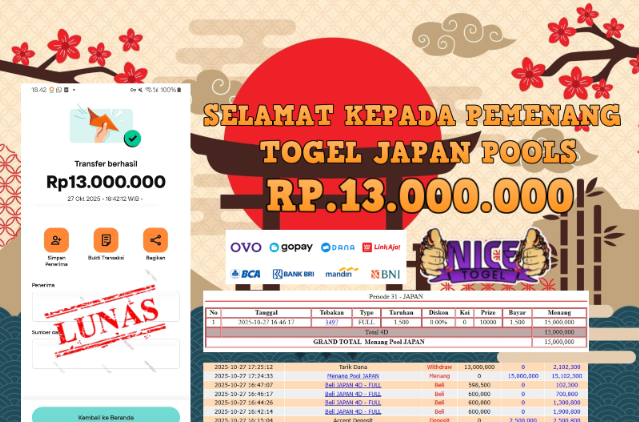 Selamat kepada User id : BUL2**** Telah berhasil mendapatkan kemenangan besar pada permainan JACKPOT TOGEL JAPAN POOLS Dengan kemenangan Sebesar Rp.13.000.000,- Setelah mengisi formulir withdraw dengan kurung waktu hanya 5 – 10 menit pihak NICETOGEL sudah melakukan transfer kepada pemilik Userid dan dana sudah dapat di cairkan oleh pemenang. Bukti pembayaran yang kami berikan merupakan bukti pembayaran yang SAH / VALID yang langung di dapatkan melaui tanda transfer transaksi dari Bank yang di tuju.
