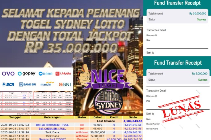 BUKTI JACKPOT TOGEL SDYNEY LOTTO Rp 35.000.000,- LUNAS
