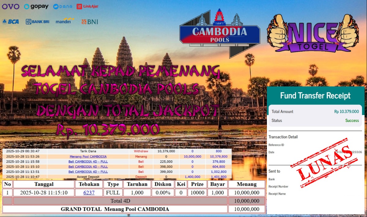 Selamat kepada User id : EGI**** Telah berhasil mendapatkan kemenangan besar pada permainan JACKPOT TOGEL CAMBODIA POOLS Dengan kemenangan Sebesar Rp.10.379.000,- Setelah mengisi formulir withdraw dengan kurung waktu hanya 5 – 10 menit pihak NICETOGEL sudah melakukan transfer kepada pemilik Userid dan dana sudah dapat di cairkan oleh pemenang. Bukti pembayaran yang kami berikan merupakan bukti pembayaran yang SAH / VALID yang langung di dapatkan melaui tanda transfer transaksi dari Bank yang di tuju.