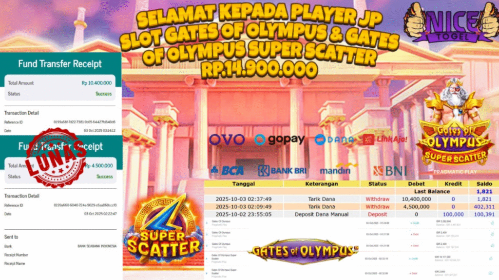 Selamat kepada User id : Desa** Telah berhasil mendapatkan kemenangan besar pada permainan JACKPOT SLOT GATES OF OLYMPUS & GATES … Baca Selengkapnya...