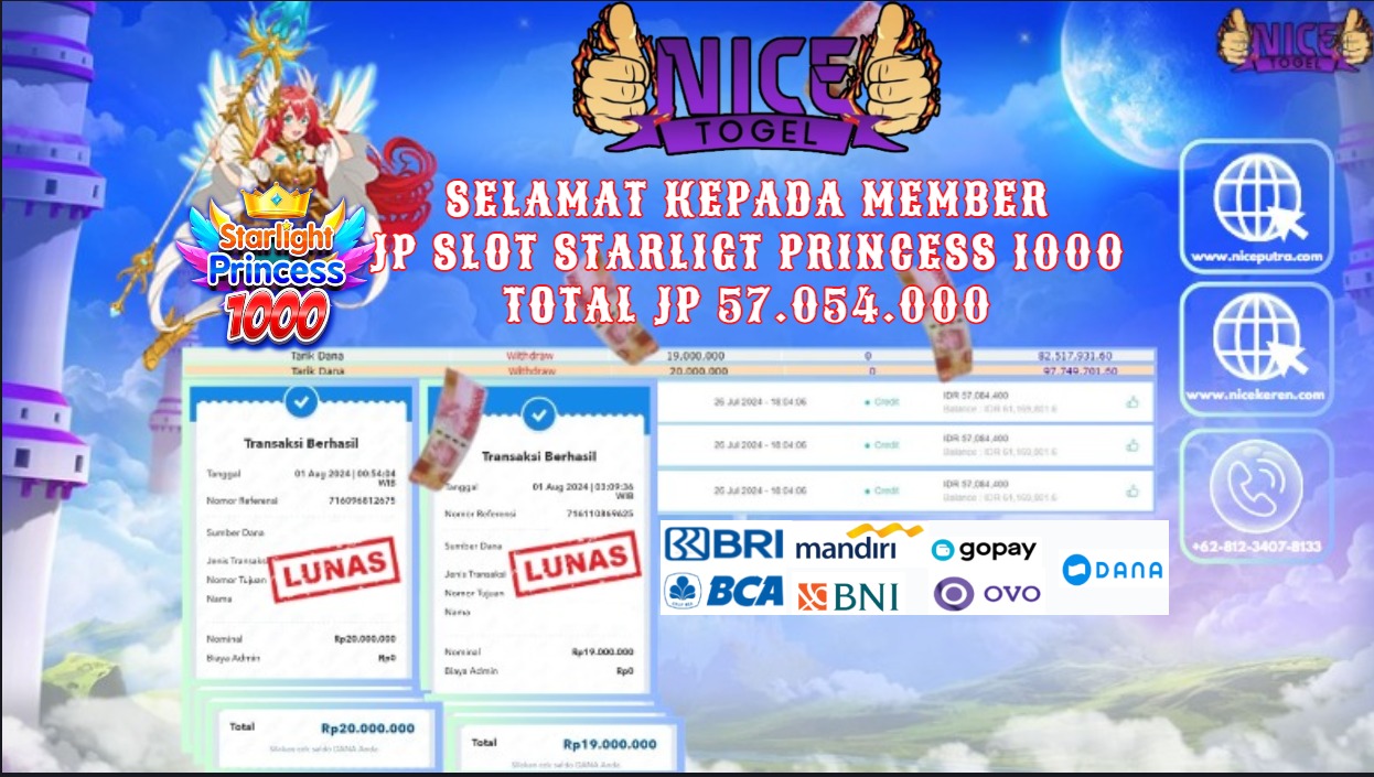 Selamat kepada User id : yud** Telah berhasil mendapatkan kemenangan besar pada permainan SLOT STARLIGHT PRINCESS 1000 Dengan kemenangan Sebesar Rp.57.054.000,- Setelah mengisi formulir withdraw dengan kurung waktu hanya 5 – 10 menit pihak NICETOGEL sudah melakukan transfer kepada pemilik Userid dan dana sudah dapat di cairkan oleh pemenang. Bukti pembayaran yang kami berikan merupakan bukti pembayaran yang SAH / VALID yang langung di dapatkan melaui tanda transfer transaksi dari Bank yang di tuju.