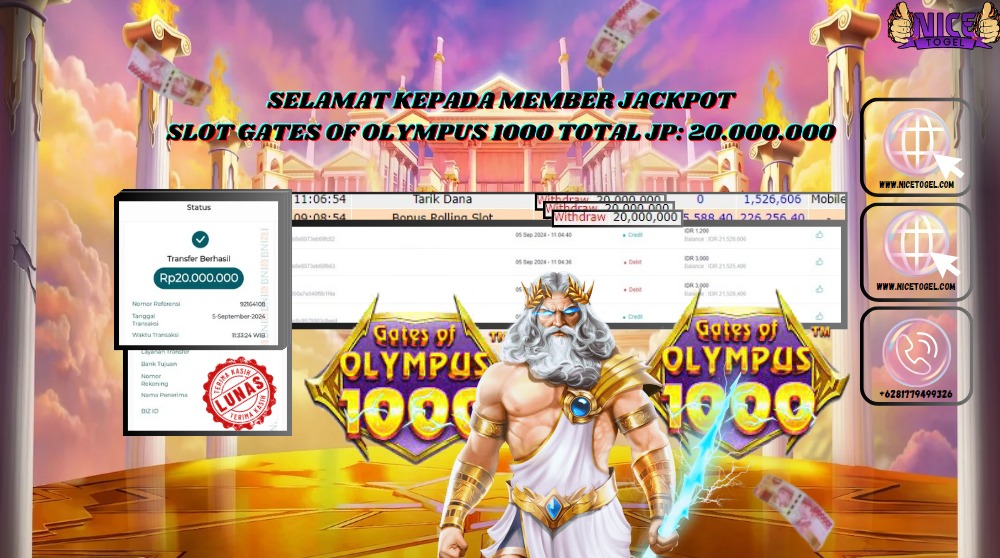 Selamat kepada User id : suda**** Telah berhasil mendapatkan kemenangan besar pada permainan SLOT GATES OF OLYMPUS 1000  Dengan kemenangan Sebesar Rp.20.000.000,- Setelah mengisi formulir withdraw dengan kurung waktu hanya 5 – 10 menit pihak NICETOGEL sudah melakukan transfer kepada pemilik Userid dan dana sudah dapat di cairkan oleh pemenang. Bukti pembayaran yang kami berikan merupakan bukti pembayaran yang SAH / VALID yang langung di dapatkan melaui tanda transfer transaksi dari Bank yang di tuju.