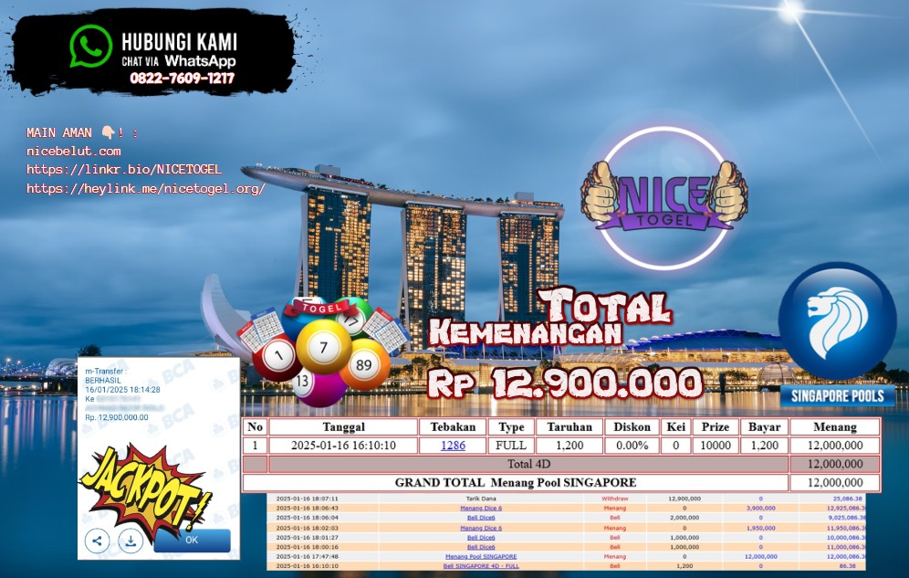 Selamat kepada User id : Komse** Telah berhasil mendapatkan kemenangan besar pada permainanTOGEL SINGAPORE POOLS Dengan kemenangan Sebesar Rp.12.900.000,- Setelah mengisi formulir withdraw dengan kurung waktu hanya 5 – 10 menit pihak NICETOGEL sudah melakukan transfer kepada pemilik Userid dan dana sudah dapat di cairkan oleh pemenang. Bukti pembayaran yang kami berikan merupakan bukti pembayaran yang SAH / VALID yang langung di dapatkan melaui tanda transfer transaksi dari Bank yang di tuju.